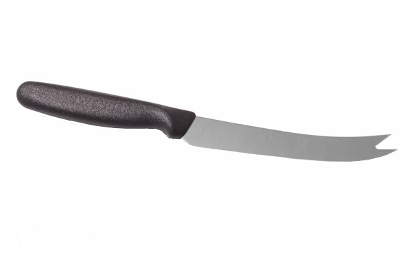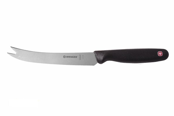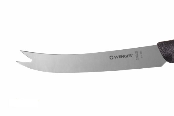 Профессиональный нож для нарезки сыра Wenger Grand Maitre с изогнутым к острию лезвием для аккуратной и точной нарезки сыра средней твердости. Раздвоенный в виде десертной вилки кончик ножа позволяет легко переносить нарезанные кусочки сыра с разделочной доски на тарелку. Лезвие изготовлено из высококачественной нержавеющей стали, обладает высокой устойчивостью к коррозии, долго остается острым. Рукоять из полиамида максимально гигиенична, не скользит, удобно лежит в руке. Нож отлично сбалансирован и долго остается острым. Подходит для мытья в посудомоечной машине. Нож упакован в подарочной коробке