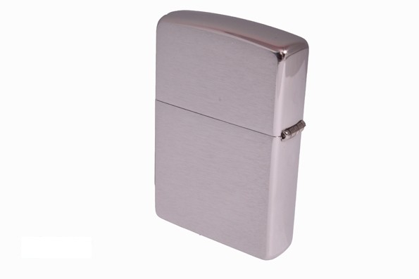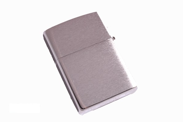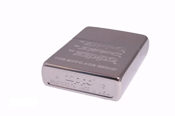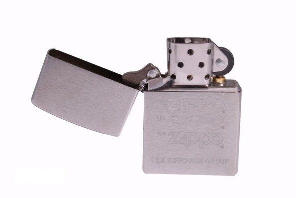 Матова хромована срібляста запальничка із характерною патентованою поверхнею Brushed Chrome™. Малюнок – етапи зміни логотипу Зіппо.