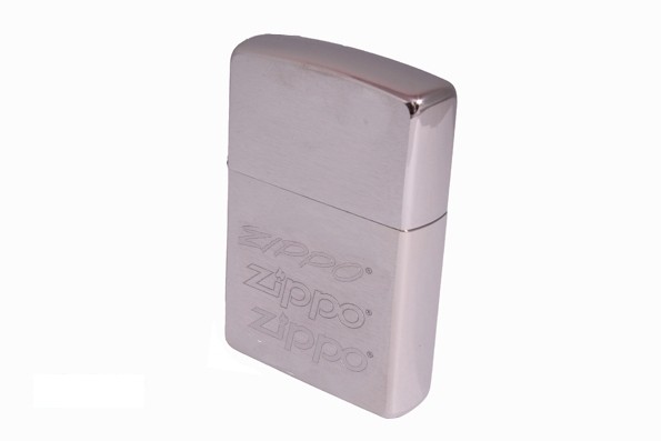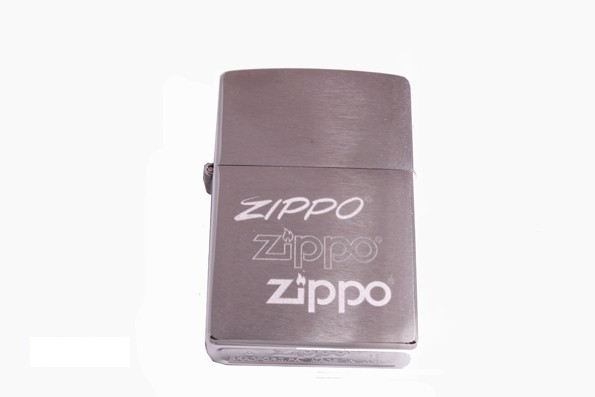 Матова хромована срібляста запальничка із характерною патентованою поверхнею Brushed Chrome™. Малюнок – етапи зміни логотипу Zippo.