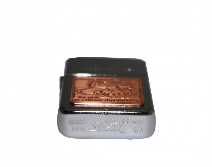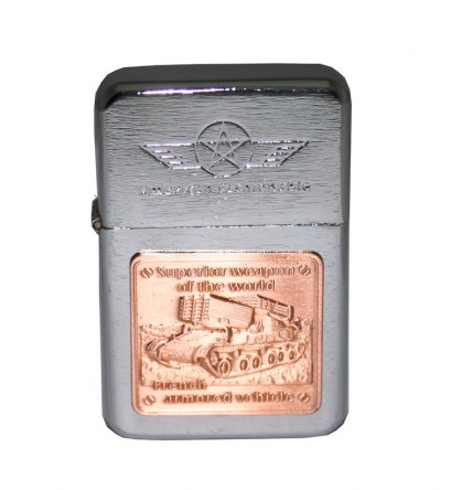Представлена запальничка виготовлена з металу сріблястого кольору з матовим шліфуванням. Лицьова сторона декорована металевою накладкою жовтого кольору із зображенням військової техніки.