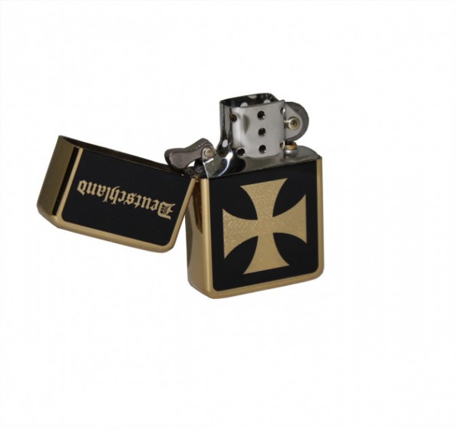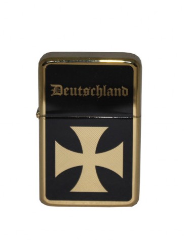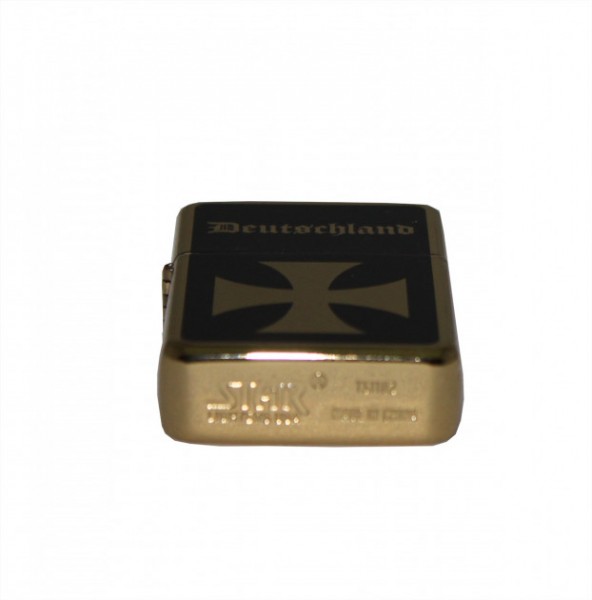 Глянцева запальничка Star золотистого кольору оздоблена малюнком грецького хреста. Запальничка упакована у подарункову коробку.