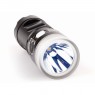 Режим индикации заряда элементов питания. После включения фонаря голубой светодиодный индикатор, находящийся под боковой белой кнопкой, будет загораться на короткие промежутки времени. В зависимости от количества вспышек определяется уровень заряда: 4 вспышки - более 80%, 3 вспышки - 40-60%, 2 вспышки - 20-40%, 1 вспышка - менее 20%. В зависимости от режима яркости и количества потребляемой энергии количество вспышек при одном и том же заряде батарей может отличаться.