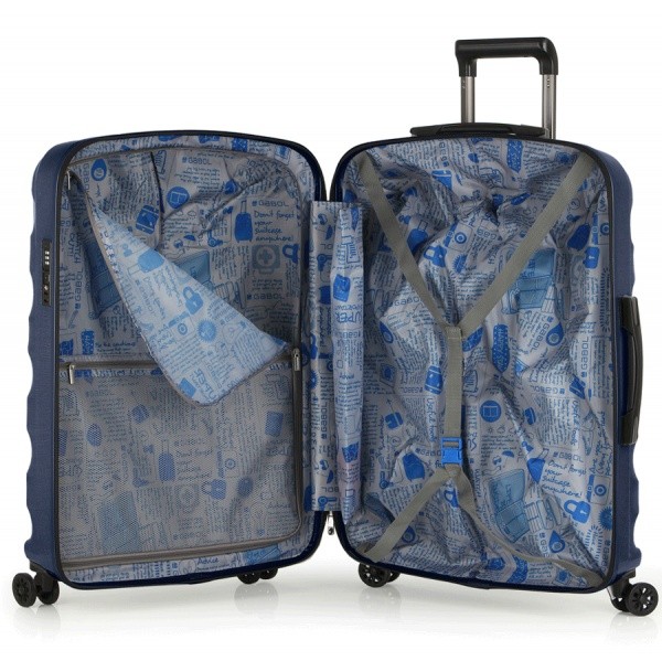 Валіза преміальної колекції Air від Gabol виконана з високотехнологічного комбінованого матеріалу - Polycarbonate/Aluminium fiber. Цей легкий, еластичний та водночас міцний матеріал. Завдяки своїм властивостям, матеріал стійкий до деформацій (після деформації набуває попередньої форми), не розтріскується на морозі, і практично без видимих пошкоджень переносить удари та механічні впливи, що дуже важливо для валіз, що перевозяться у багажних відділеннях. Внутрішній об'єм валізи має ремені для фіксації речей, а також додаткові кишені на блискавках для дрібних аксесуарів.