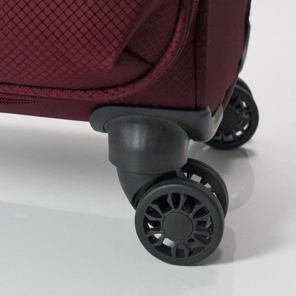 Валіза оснащена чотирма спареними роликовими колесами із високотемпературного термопластичного поліуретану (TPU). Матеріал має міцність порівнянну з пластиком, гнучкістю силікону, а також має підвищену стійкість до перепадів температур. Відмінною особливістю коліс із TPU матеріалу є зниження шуму до мінімуму при коченні валізи по нерівній поверхні. Завдяки стійкості до стирання матеріал коліс відрізняється тривалим терміном експлуатації.