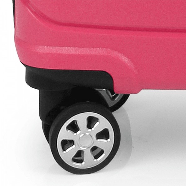 Валіза оснащена чотирма повноповоротними спареними колесами з можливістю незалежного розвороту кожного колеса на 360°. Системою передбачено рівномірний перерозподіл навантаження на кожне колесо, що у свою чергу сприяє плавному коченню та маневреності валізи, докладаючи при цьому мінімум зусиль. Колеса виготовлені із високотемпературного термопластичного поліуретану (TPU). Матеріал має міцність порівнянну з пластиком, гнучкістю силікону, а також має підвищену стійкість до перепадів температур. Відмінною особливістю коліс із TPU матеріалу є зниження шуму до мінімуму при коченні валізи по нерівній поверхні. Завдяки стійкості до стирання матеріал коліс відрізняється тривалим терміном експлуатації.