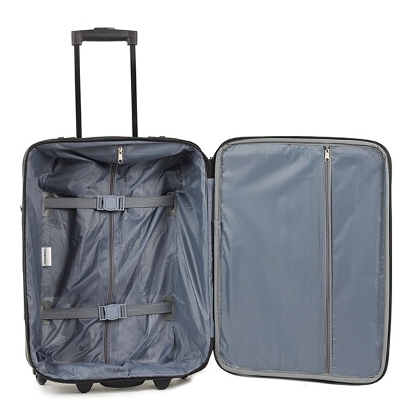 Валіза має прогумовану, добре захищену пару роликових коліс. Висувна телескопічна ручка має два фіксовані положення. Додаткову зручність надають дві ручки для транспортування валізи в руках вертикально чи горизонтально. На фасадній частині розміщена велика кишеня, яка зручно розстібається. Внутрішній об'єм має еластичні ремені для фіксації речей та кишеню на блискавці.