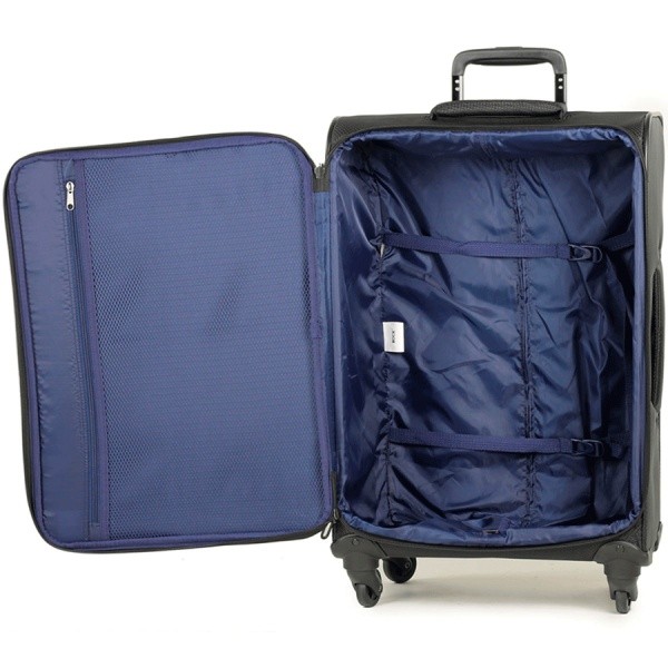 Всередині валіза оснащена компресійними стяжками та кишенею на блискавці. Дрібні речі та речі першої необхідності можна розмістити у фасадних кишенях. Системою передбачено рівномірний перерозподіл навантаження на кожне колесо, що у свою чергу сприяє плавному коченню та маневреності валізи. Модель має висувну телескопічну ручку із фіксатором. Для захисту валізи від зовнішніх пошкоджень передбачено пластиковий захист дна та кутів корпусу.