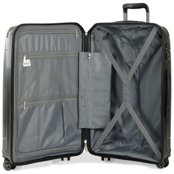 Лінійка валіз Rock Lexington виконана з поліпропілену. Висока жорсткість, ударна міцність і кутові протектори в сукупності з хорошою стійкістю до деформацій дозволяє перевозити ці валізи в багажних відділеннях навіть порожніми або заповненими наполовину, не побоюючись за їх цілісність. Збереження речей та цілісність валізи також забезпечує вбудований кодовий замок. Всередині валіза рівномірно поділяється на дві половини за допомогою перегородки на блискавці. Для зручності організації речей усередині передбачені компресійні стяжні ремені та кишені на блискавці.