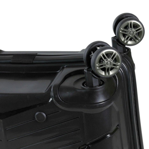 Валіза оснащена чотирма спареними роликовими колесами з можливістю незалежного розвороту кожного колеса на 360 °. Системою передбачено рівномірний перерозподіл навантаження на кожне колесо, що у свою чергу сприяє плавному коченню та маневреності валізи, докладаючи при цьому мінімум зусиль.
