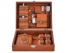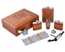 Шикарний подарунковий набір складається з 3 фляг, портсигара, 4 чарочок, штопора у вигляді пляшки вина, запальнички та лійки. Все упаковано в подарункову дерев'яну коробку, нагорі знаходиться шкіряна вставка з нанесеним тисненням.