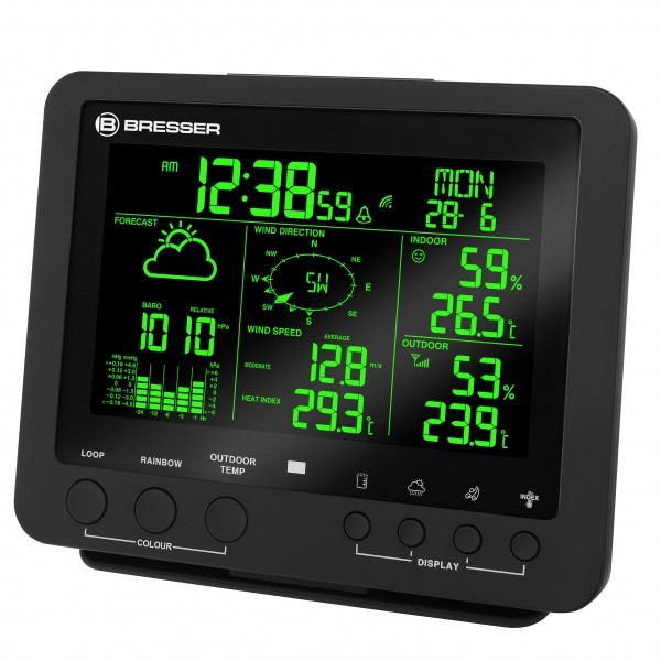 Сучасна метеостанція з прогнозом погоди Bresser Weather Center 5-in-1 256 colour забезпечує вимірювання таких важливих метеопараметрів як величина атмосферного тиску, швидкість та напрям вітру, рівень, опадів, температура та відносна вологість повітря. Вбудована функція тривожних сповіщень попередить вас про вихід вимірюваних параметрів за вказані межі. Усі датчики скомпоновані в єдиному блоці, що значно спрощує та прискорює процес встановлення та монтажу. Унікальний цифровий дисплей BTN (Black Twist Nematic) має широкий кут огляду та високий контраст. Функція «хамелеон» дозволить вам вибрати один із 256 кольорів свічення дисплея або ж запустити режим плавної зміни всіх кольорів, вибравши при цьому найбільш відповідну яскравість свічення. Колір індикації може змінюватись в залежності від температури навколишнього середовища.