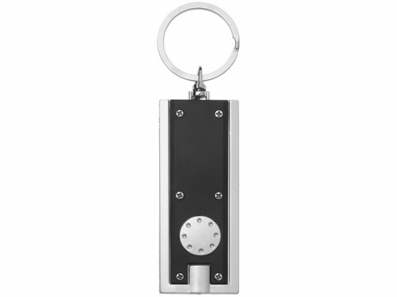 Брелок-ліхтарик Castor. Брелок з яскравим світлодіодним ліхтариком із кнопкою. Металеве кільце для ключів. Батарейки включені у комплект. АБС-пластик.