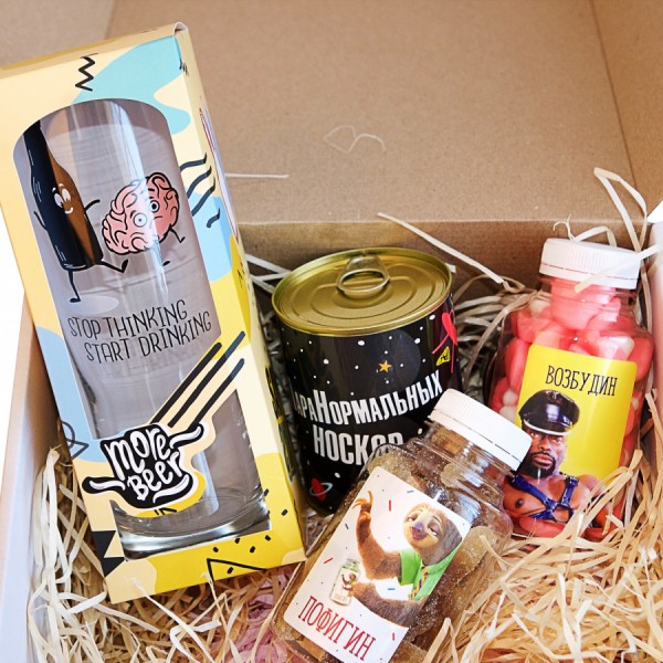 - Бокал, конфеты - 2 банки, консерва-носок