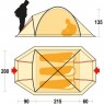 комплектації), кг: 5.2 намети без фіксації кілочками та штормовими відтяжками (фіксації вимагає лише дуга тамбуру), що особливо важливо при встановленні на снігу, на піску або в місцях, де рельєф не дозволяє добре зафіксувати кілочки. Намет такого типу через взаємне перетинання дуг, що спираються в землю, і через обтічну форму має високу стійкість до вітрових і снігових навантажень. Намет, що вільно стоїть, без відтяжок вимагає мінімум настановної площі. Дуга тамбура збільшує його корисний об'єм і формує навіс від дощу при відкритому тамбурі. Внутрішній намет до дуг кріпиться за допомогою гачків. покращує стійкість намету до вітрових навантажень, спрощує встановлення у місцях зі складним рельєфом та збільшує теплоізоляцію. Для покращення вентиляції снігозахисна спідниця може бути піднята з будь-якого боку. Обидва входи в намет оснащені москітною сіткою. Конструкцією передбачено два вентиляційні вікна, розташовані в торцях намету, які забезпечують нормальний рівень вентиляції. В особливо вологих умовах можна підняти снігозахисну спідницю для швидкого виведення конденсату. Матеріал тенту та підлоги внутрішнього намету має триразове посилення в точках із передбачуваним збільшеним навантаженням. Посилення виконане у вигляді додаткового шару тканини високої міцності Стропи контролю натяжки зовнішнього тенту дозволяють контролювати і регулювати натяг зовнішнього тенту при добових змінах температури Усередині намету передбачено дві бічні кишені для дрібниць і верхню натяжну кишеню для розсіяного освітлення або інших дрібниць.