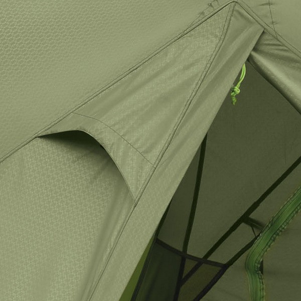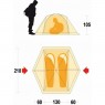 1300 х 1050 Зовнішній намет (ДхШх5) 0 х : 1 У складеному вигляді , мм : ? -Півсфери з поперечною консольною дугою - можливість встановлення такого намету без фіксації кілочками, що особливо важливо при встановленні на снігу, на піску або в місцях, де рельєф не дозволяє добре зафіксувати кілочки. Намет такого типу через взаємне перетинання дуг, що спираються в землю, і через обтічну форму має високу стійкість до вітрових і снігових навантажень. Намет, що вільно стоїть, без відтяжок вимагає мінімум настановної площі. Третя консольна дуга збільшує корисний об'єм намету і формує навіс від дощу при відкритих тамбурах . ступеня покращує стійкість намету до вітрових навантажень, спрощує встановлення у місцях зі складним рельєфом та збільшує теплоізоляцію. Для покращення вентиляції снігозахисна спідниця може бути піднята з будь-якого боку. Обидва входи в намет оснащені москітною сіткою. Конструкцією передбачено два вентиляційні вікна, розташовані з боку входів у намет. Їх особливістю є можливість закривати вікна не лише зовні, а й зсередини. Система вентиляції Camera Air створює велику повітряну камеру між зовнішнім тентом і внутрішнім наметом, що сприяє вільній циркуляції повітря навколо внутрішнього намету. З одного боку це позбавляє появи конденсату всередині, а з іншого боку повітря є кращим теплоізоляційним прошарком. Матеріал тенту та підлоги внутрішнього намету має триразове посилення в точках із передбачуваним збільшеним навантаженням. Посилення виконане у вигляді додаткового шару тканини високої міцності Усередині намету передбачено чотири середньорозмірні кишені для укладання москітної сітки дверей або інших дрібниць. Намет оснащений гачком для підвісу кемпінгового ліхтаря всередині.