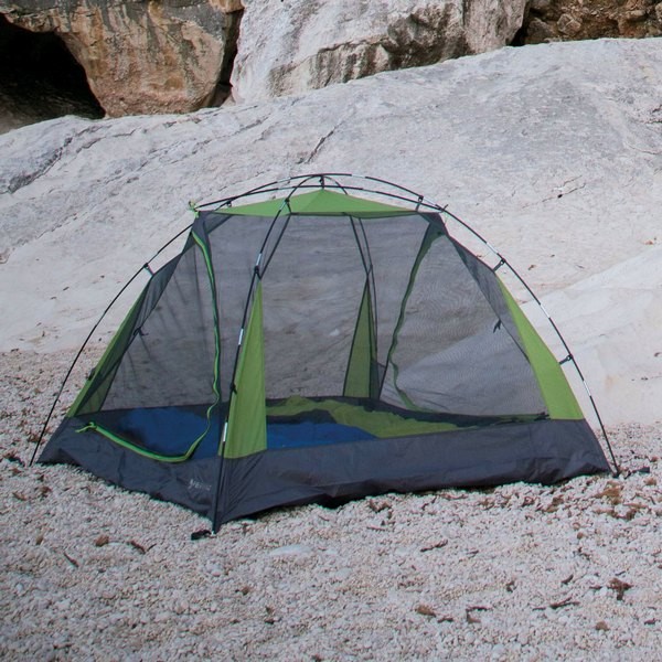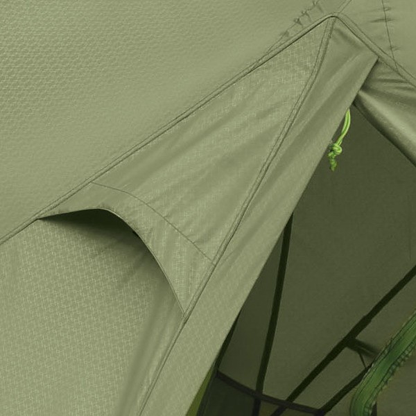 : Green (зелений) Габарі Внутрішній намет (ДхШхВ), мм: 2100 х 1600 х 1100 Зовнішній намет (ДхШхВ), мм: 2100 х 2800 х 1100 У складеному вигляді , мм: ? ремкомплекту та кілочків), кг: 2.75 Вага намету (у повній комплектації), кг: 3.15 Особливості конструкції: Основні переваги купольного намету-півсфери з поперечною консольною дугою - можливість встановлення такого намету без фіксації кілочками, що особливо важливо при встановленні на снігу, на піску або у місцях, де рельєф не дозволяє добре зафіксувати кілочки. Намет такого типу через взаємне перетинання дуг, що спираються в землю, і через обтічну форму має високу стійкість до вітрових і снігових навантажень. Намет, що вільно стоїть, без відтяжок вимагає мінімум настановної площі. Третя консольна дуга збільшує корисний об'єм намету і формує навіс від дощу при відкритих тамбурах . ступеня покращує стійкість намету до вітрових навантажень, спрощує встановлення у місцях зі складним рельєфом та збільшує теплоізоляцію. Для покращення вентиляції снігозахисна спідниця може бути піднята з будь-якого боку. Обидва входи в намет оснащені москітною сіткою. Конструкцією передбачено два вентиляційні вікна, розташовані з боку входів у намет. Їх особливістю є можливість закривати вікна не лише зовні, а й зсередини. Система вентиляції Camera Air створює велику повітряну камеру між зовнішнім тентом і внутрішнім наметом, що сприяє вільній циркуляції повітря навколо внутрішнього намету. З одного боку це позбавляє появи конденсату всередині, а з іншого боку повітря є кращим теплоізоляційним прошарком. Матеріал тенту та підлоги внутрішнього намету має триразове посилення в точках із передбачуваним збільшеним навантаженням. Посилення виконане у вигляді додаткового шару тканини високої міцності Усередині намету передбачено чотири середньорозмірні кишені для укладання москітної сітки дверей або інших дрібниць. Намет оснащений гачком для підвісу кемпінгового ліхтаря всередині .
