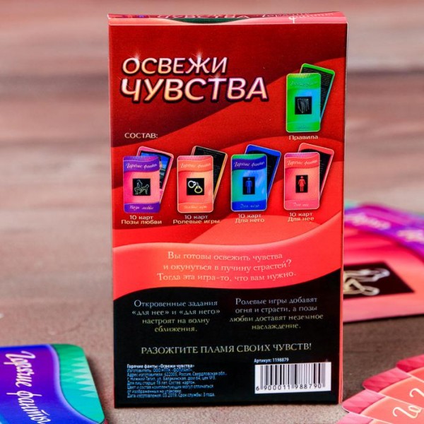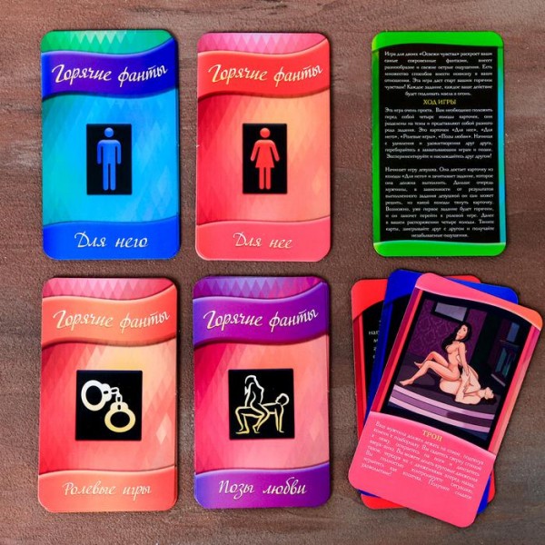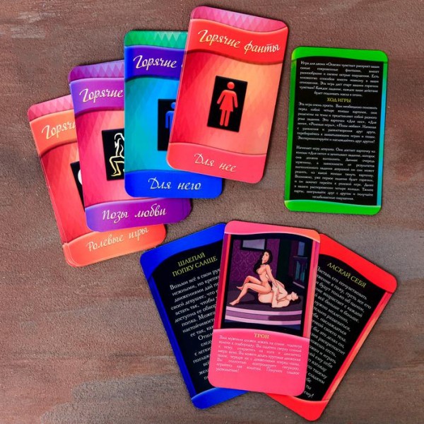 У картках «Для неї» ви знайдете завдання, здатні до краю порушити бажання партнера. Колода «Для нього» таїть секрети насолоди для партнерки. Картки «Пози кохання» – це неймовірні описи сексуальних позицій, що супроводжуються відвертими ілюстраціями. А на солодке ми приготували колоду «Рольові ігри» — з нею ви подаруєте одне одному нові емоції та відчуття.
