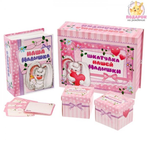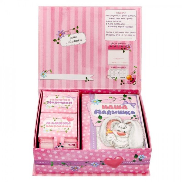 - велика коробка для зберігання набору з місцем під фотографію на кришці та анкетою малюка.