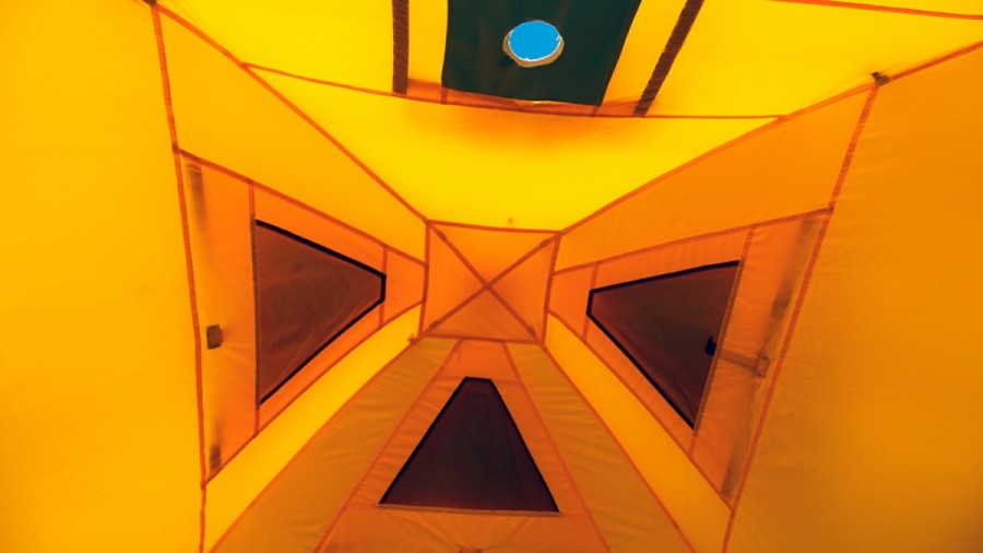 У той же час, відсутність купольної вентиляції та можливість застосування теплообмінника, дозволяє вам використовувати цю модель і взимку, наприклад, на зимовій рибалці. Для цього вам потрібно лише застебнути всі вітро/вологозахисні стіни на входах і такі ж шторки на вентиляційних вікнах. Конфігурація підлоги намету є восьмикутником. Намет має чотири великі входи-двері. Кожна з них закривається протимоскітною сіткою та дублюється вітро/водозахисними стінками. Для покращення вентиляції в літній час між кожним входом є чотири досить великі трикутні вентиляційні вікна. Вони також мають протимоскітні сітки, що дублюються вітро/водозахисними шторками. Сама форма намету – сфера, яка передбачає те, що дана модель витримуватиме дуже серйозні вітрові навантаження. Для того, щоб налагодити освітлення намету ввечері, передбачена система із зашлюбованого шнура із закріпленим на ньому карабіном. Достатньо пристебнути до карабіну лампу або ліхтар, підняти його під купол і зафіксувати шнур. Внизу тент намету обладнаний спідницею.