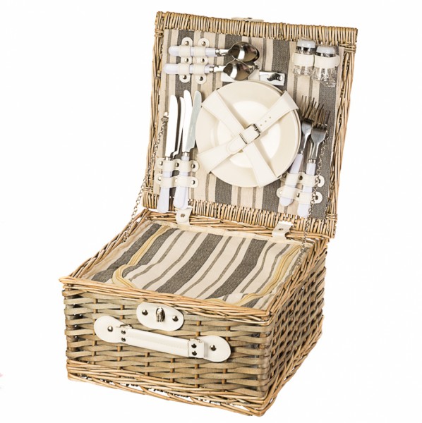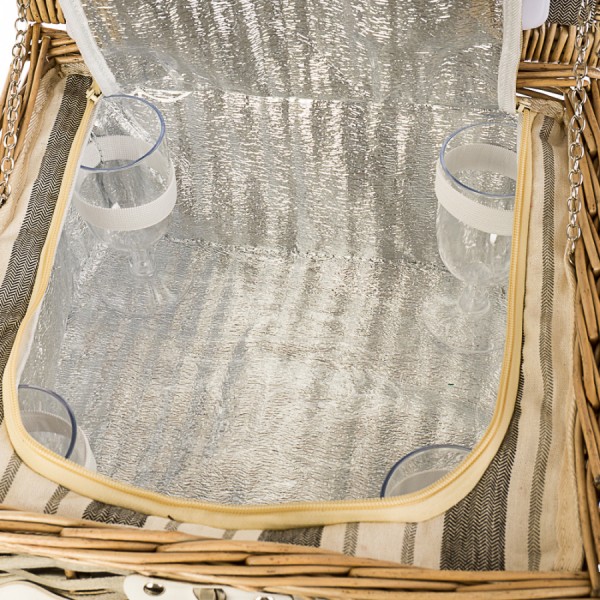 Кошик із плетіння надміцної лози виглядає вишукано та благородно. Вона поєднала в собі зручність, красу та функціональність. Цей пікніковий набір розрахований на 4-х осіб. Все необхідне для пікніка закріплюється на кришці кошика, а знизу знаходиться холодильна камера. Вона дозволить зберегти ваші продукти свіжими довгий час, а стильний дизайн подарує естетичне задоволення своєму власнику. У набір входить: 4 вилки, 4 ножі, 4 ложки з нержавіючої сталі з пластиковою ручкою; 4 керамічні тарілки; 4 пластикові келихи для вина; 1 пластиковий набір із сільничкою/перечницею; 1 штопор; 1 сумка-холодильник.