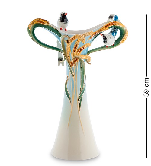 Оригінальна порцелянова ваза «Пара птахів» створена дарувати чудовий настрій, адже її зовнішній вигляд настільки незвичайний, що хочеться розібратися, а навіщо всі ці плавно вигнуті лінії? Або це своєрідний елемент декору або хитромудрі форми служать, щоб вазу було легше брати. Основне ніжно-блакитне тло нагадує небо, а на передньому плані видно невеликі колоски пшениці. Птахи невеликого розміру чудово доповнюють загальну гармонійну картину.
