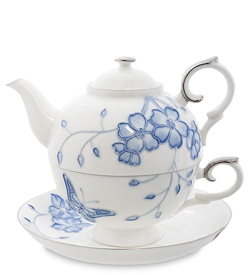 Коли набір ставиться на зберігання, блакитний квітковий візерунок, що йде з боків чашки і чайника, зливається в одне ціле зображення, на якому серед гілок з блакитними пелюстками квітів пурхають блакитні метелики. Витонченість форми та кольору послужать доповненням аромату та смаку чаю – це буде воістину церемоніальне чаювання!