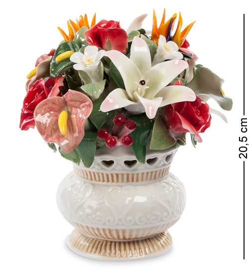Ця біла візерункова ваза своїм м'яким малюнком начебто підкреслює яскравість кольорів, які в неї поставлені. А букет радує своїм достатком фарб: сліпучо-білі, бардово-червоні, ніжно-рожеві квіти різних видів створюють продуману композицію, здатну доставити естетичне задоволення. І не віриться, що ці квіти – не живі, зрізані щойно, а виготовлені з найтоншої порцеляни. Такий кошик хіба що не пахне квітами, зате свіжим залишиться не один рік. Приємно дарувати живі квіти, але чому б і не вручити такий вічний букет, якщо він не менш гарний, ніж справжній?