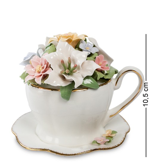 З цієї гарної чашки із позолоченими краями чаю не напитися. Все місце всередині чайки зайняте квітами. Не віриться, що ці різнокольорові пелюстки виконані з порцеляни – настільки вони тонкі та яскраві, наче живі. Так що місце для цієї чашки із блюдечком та квітами – не на обідньому столі, а на полиці із сувенірами. Такий своєрідний букет радуватиме цілий рік, ці квіти не зав'януть ніколи, щодня і за будь-якої погоди піднімаючи настрій. На день народження будь-якій жінці можна подарувати букет живих квітів і такий букетик в чашці - на згадку. Один букет доповнить інший.