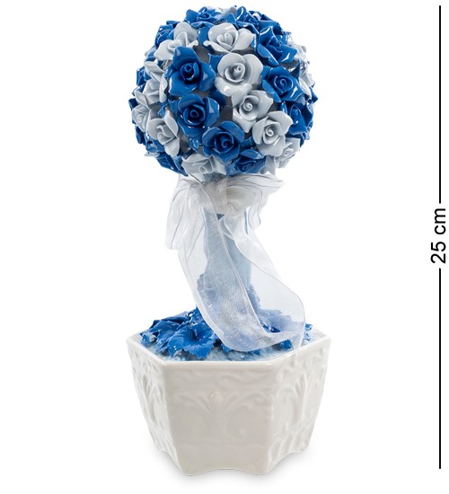 Виріб виконаний з порцеляни у вигляді своєрідного топіарію, що складається з ніжних бутонів троянд. У декорі композиції використовується білий бант із легкої органзи, рельєфні візерунки та мініатюрні квіткові фігурки. Порцеляновий букет оформлений трьома відтінками – синім, сірим та білим, які вдало поєднуються один з одним, роблячи композицію ще більш вишуканою та витонченою.