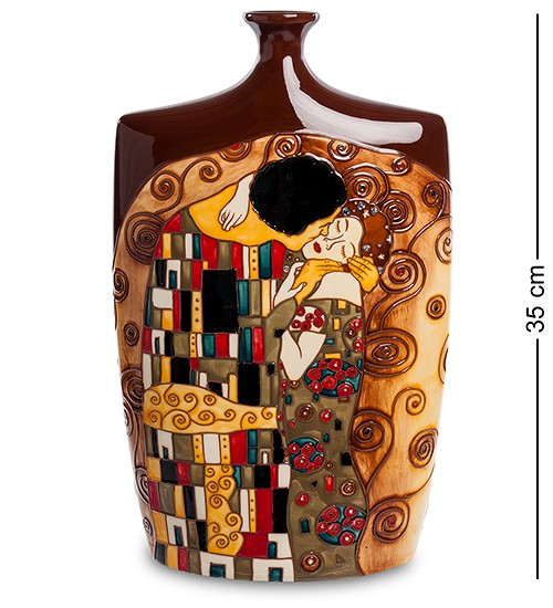 Цікава та оригінальна ваза «Поцілунок» квадратної форми виконана приголомшливо. З першого погляду важко здогадатися, що це ваза, а не шикарне панно на стіну. Але не лише форма в ній незвичайна, викликає інтерес та розпис, де художник потрудився створити сцену милого поцілунку жінки та чоловіка.