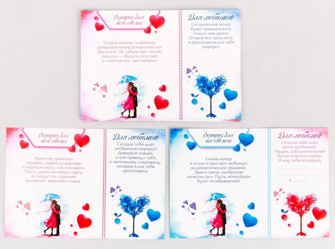 На листочках «Сюрприз для неї від нього» написано сюрпризи, які чоловік робитиме для своєї дівчини. А на листочках «Сюрприз для нього від неї» — сюрпризи, які дівчина має приготувати для свого чоловіка.