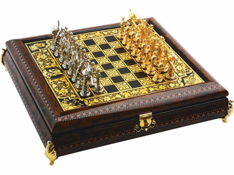 Ці іспанські шахи – це шедевр ювелірного мистецтва. Цінні породи дерева інкрустовані золотом та сріблом у мавританському стилі. Фігурки – мініатюри героїв безсмертного роману Сервантеса «Дон Кіхот». Будь-яка партія, зіграна у ці шахи, запам'ятається на все життя.