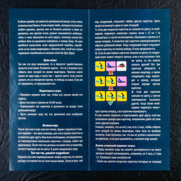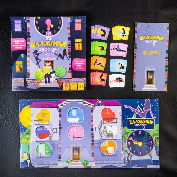 У цій грі можуть грати від двох учасників. У процесі задіяні відразу всі гравці. Мета гри - зібрати всіх сусідів у пустотливих позах по своїх квартирах за відведений час. Час грає проти вас, не змогли зібрати три однакові картки із сусідами, стрілка пересувається на годину вперед. Можете ускладнювати гру, коли кожен грає сам за себе, тоді на початку гри розподіліть, хто яким сусідам допоможе потрапити у свої квартири, кожен відповідатиме за певний колір карток і шукатиме саме їх. У вас є 3 варіанти гри, вибирайте той, який найбільше подобається, і починайте веселощі!