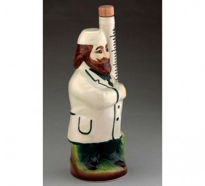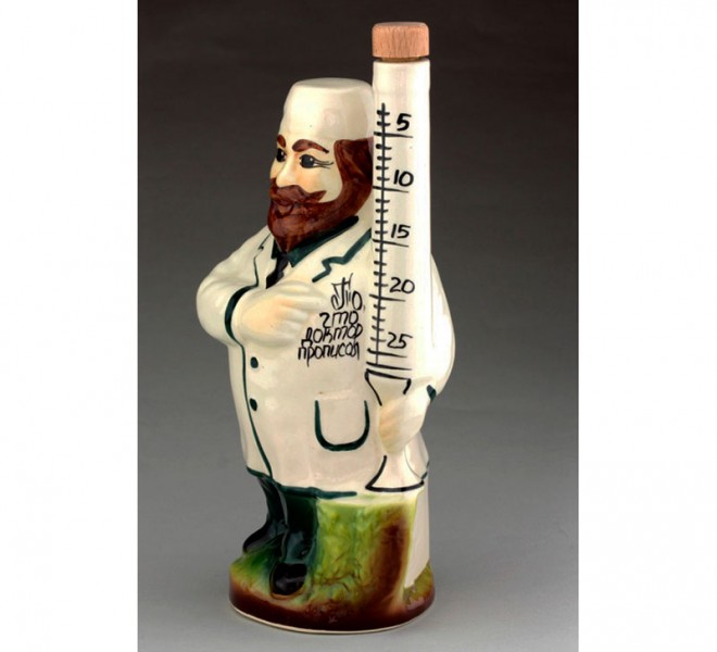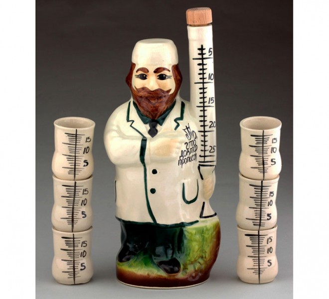 Графін - пляшка виконана у вигляді лікаря - лікаря, шийка якої знаходиться у великому ... градуснику. Знизу напис "Те, що лікар прописав!" А чарки, хвацько розписані вручну теж під поділ "градусника"