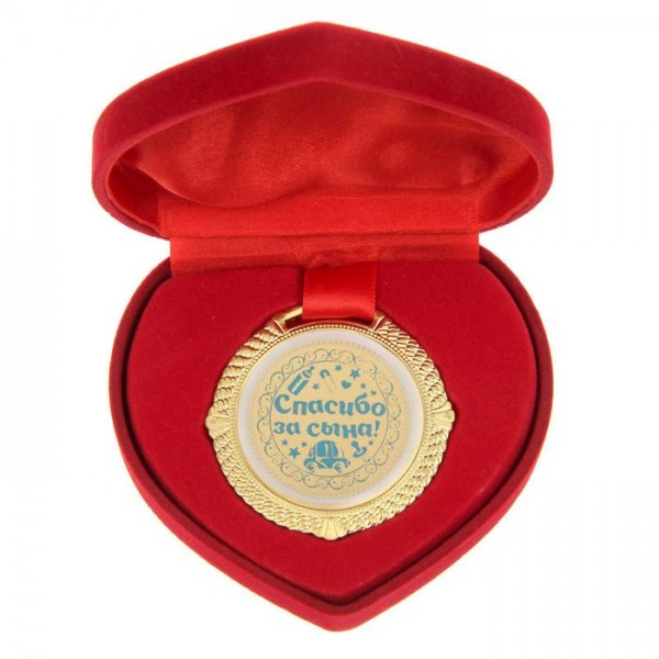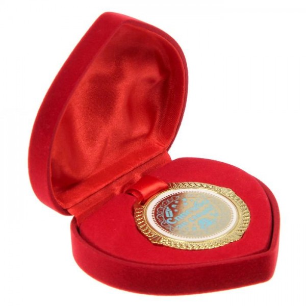 Фігурний виріб виконаний із металу золотого кольору. На звороті написані теплі слова. А щоб ви одразу змогли надіти медаль на отримувача, ми додали в комплект стрічку. Виріб подається в урочистій червоній коробочці у формі серця.