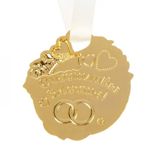 Хотите ярко и необычно поздравить близких людей с годовщиной такого важного дня? Изделие подчеркнёт всю торжественность этого события. Медаль эксклюзивной формы изготовлена из металла под золото и украшена великолепными сияющими стразами. Она преподносится на нежной оригинальной резной открытке с золотым тиснением. Внутри написаны красивые искренние поздравления!