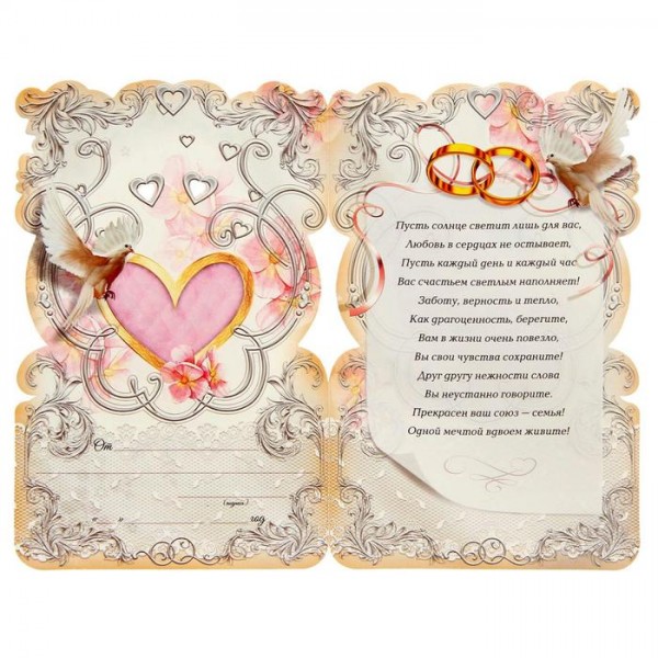 Бажаєте яскраво та незвичайно привітати близьких людей з роковинами такого важливого дня? Виріб підкреслить усю урочистість цієї події. Медаль ексклюзивної форми виготовлена з металу під золото та прикрашена чудовими сяючими стразами. Вона подається на ніжній оригінальній різьбленій листівці із золотим тисненням. Всередині написані гарні щирі вітання!