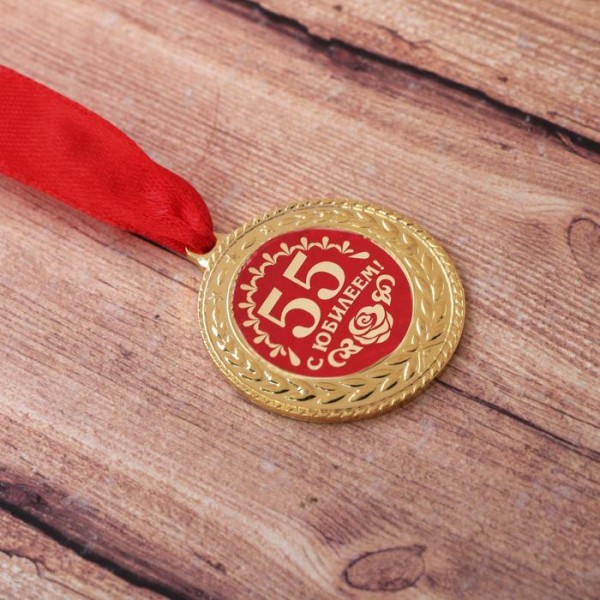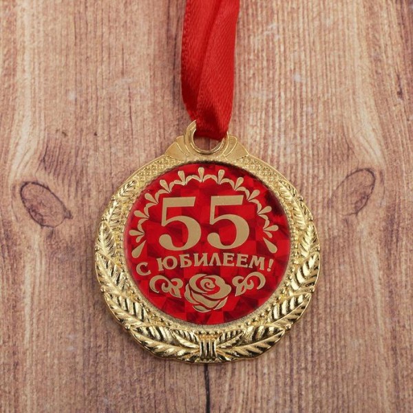Хотите поздравить супругов с годовщиной брачной жизни по-особенному? Медаль "С юбилеем 55!" подчеркнёт торжественность данного события. Награда изготовлена из металла золотого цвета и дополнена красной лентой.