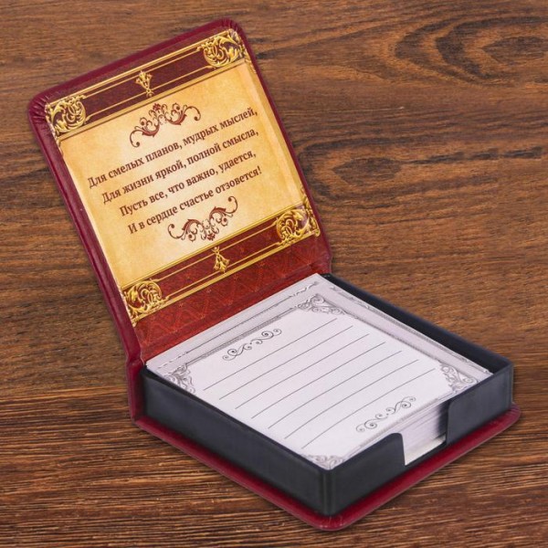 Щоб зафіксувати важливу інформацію, достатньо мати при собі непомітний, але необхідний у побуті предмет — паперовий блок у футлярі з екошкіри "Для мудрих думок". Цей аксесуар займе мінімум місця в сумці або на робочому столі.