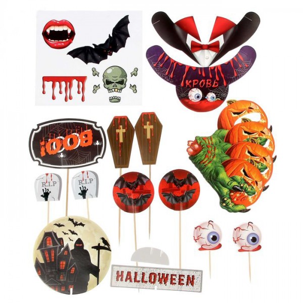 У наборі для проведення Хеллоуїна ви знайдете все для веселого та таємничого свята. З його допомогою ви зможете задекорувати зал або кімнату, де проходитиме захід, і провести його, адже на підкладці ви знайдете цікаві ігри.