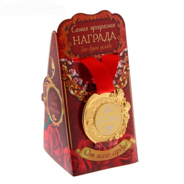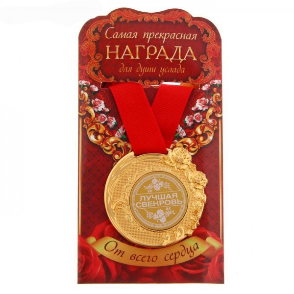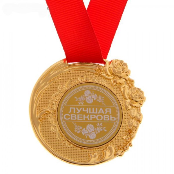 Медаль "Лучшая свекровь" диаметром 5 см изготовлена из металла под золото. Лицевая и оборотная стороны украшены фигурными элементами. Вставка в центре диаметром 3,8 см сделана из металла с белым нанесением. Сувенир дополнен яркой красной лентой, благодаря которой награду можно сразу надеть на виновника торжества.