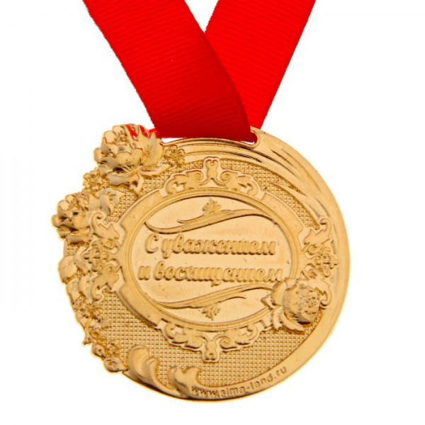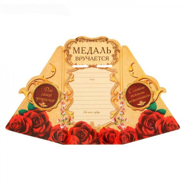 Медаль преподносится на яркой подарочной открытке с полями для имени адресата и пожеланий.