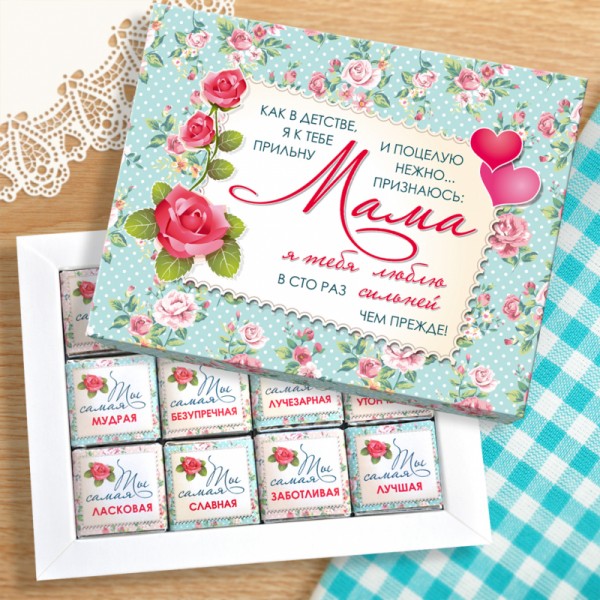 Ніжний і світлий набір зачепить серце кожної мами. На шоколадних плитках ви знайдете щирі та теплі слова-компліменти на адресу найдорожчих та улюблених мам.