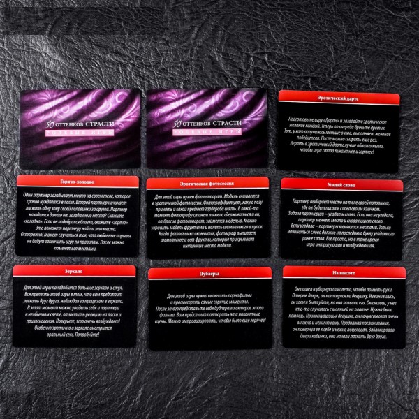 Гра 50 відтінків пристрасті складається з 30 пікантних сценаріїв та рольових ігор, які принесуть неймовірне задоволення. А ще в коробці є сюрприз: кубики, які можна використовувати окремо від карток.