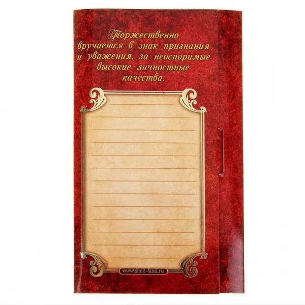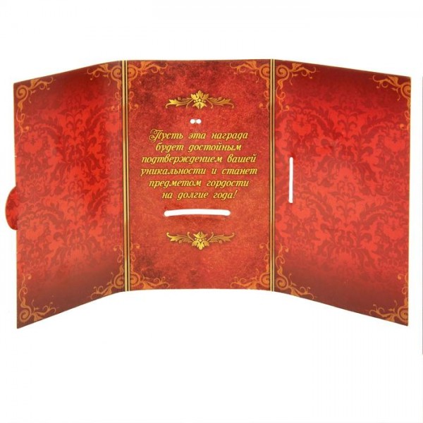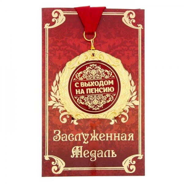 Медаль на листівці ""З Виходом на пенсію" виготовлена із золотистого металу та упакована у листівку з урочистим вітанням для адресата. Сувенір доповнений яскравою червоною стрічкою, завдяки якій винагороду можна відразу надіти на винуватця урочистості.