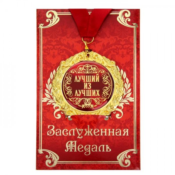 Оригінальна медаль – чудова нагорода для найдостойніших представників свого часу. Ексклюзивний сувенір стане гідною прикрасою вечора та допоможе створити незабутнє привітання! Медаль на листівці "Найкращий з найкращих" виготовлена із золотистого металу, йде в комплекті зі стрічкою, упакована у листівку з урочистим вітанням для адресата. Дивуйте та нагороджуйте!