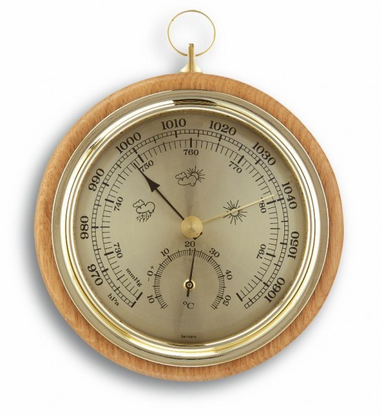 Класичний прилад із масиву дерева складається з барометра та термометра. Барометр вимірює тиск повітря та дозволяє вам скласти місцевий прогноз погоди. Хоча погода покращується зі збільшенням тиску повітря, слід очікувати поганої погоди зі зменшенням тиску повітря.