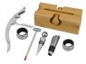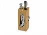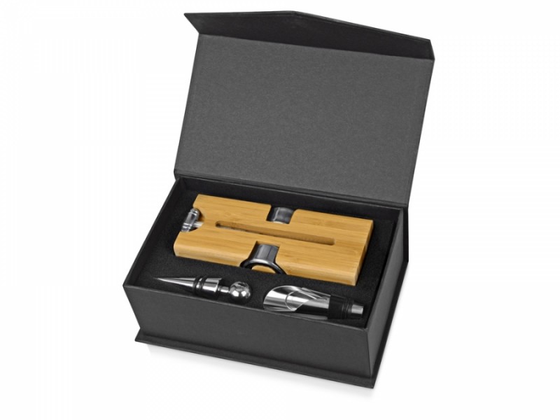 Стильний набір аксесуарів для вина на дерев'яній підставці допоможе легко відкрити пляшку та акуратно розлити напій за допомогою штопора-відкривалки, пристрої для розливу вина та двох комірців на пляшку. У набір також входять пробка для пляшки та термометр. Оригінальна дерев'яна підставка красиво виглядатиме на столі.