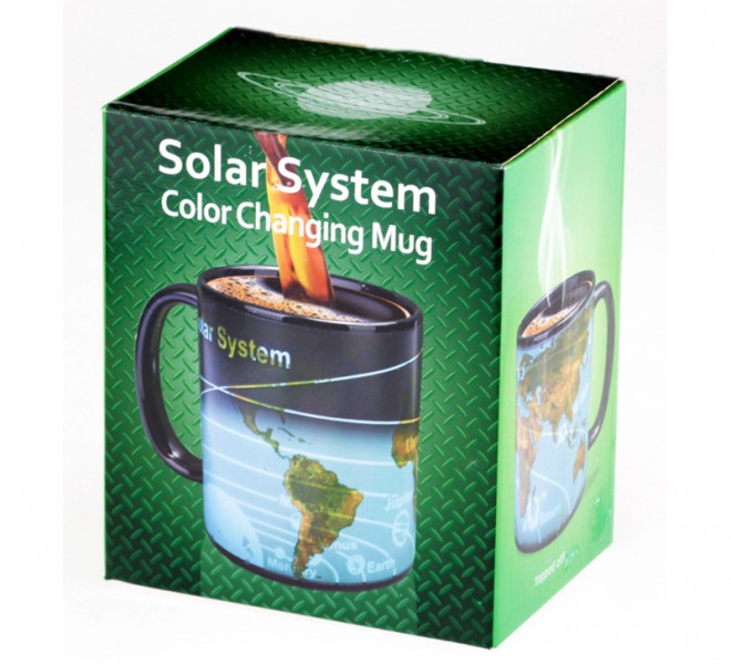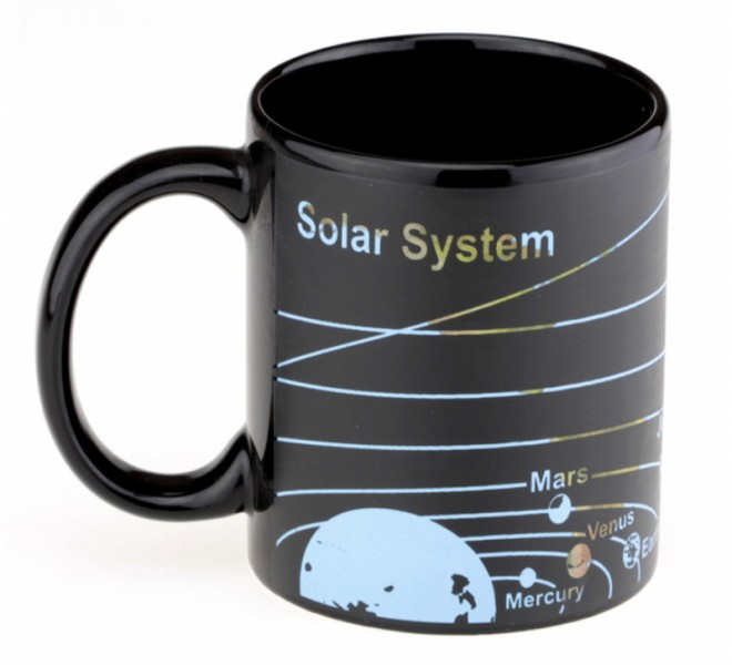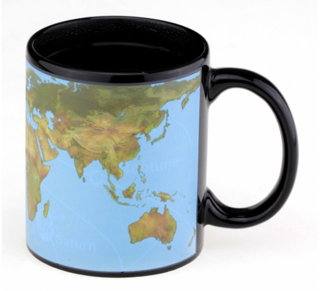 У звичайному стані - картинка темна з розташуванням планет Сонячної системи. А якщо в кухоль налити гарячий напій - виявляться континенти і материки землі.