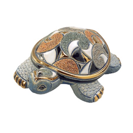 Черепаха Галапагоська De Rosa Rinconada Families Dr127f-53 - керамічна фігурка ручної роботи у вигляді черепахи, виготовлена уругвайськими майстрами. Все розписано індивідуально вручну фарбами, позолотою, кожна деталь ретельно опрацьована. Виконано в синіх та коричневих тонах, із позолоченими елементами.